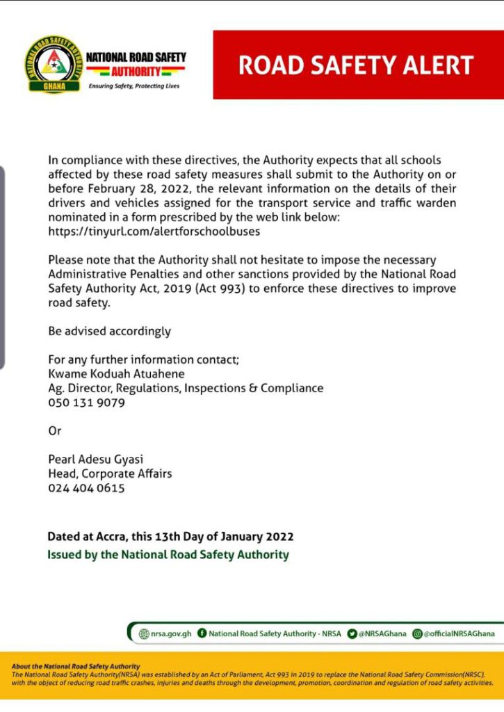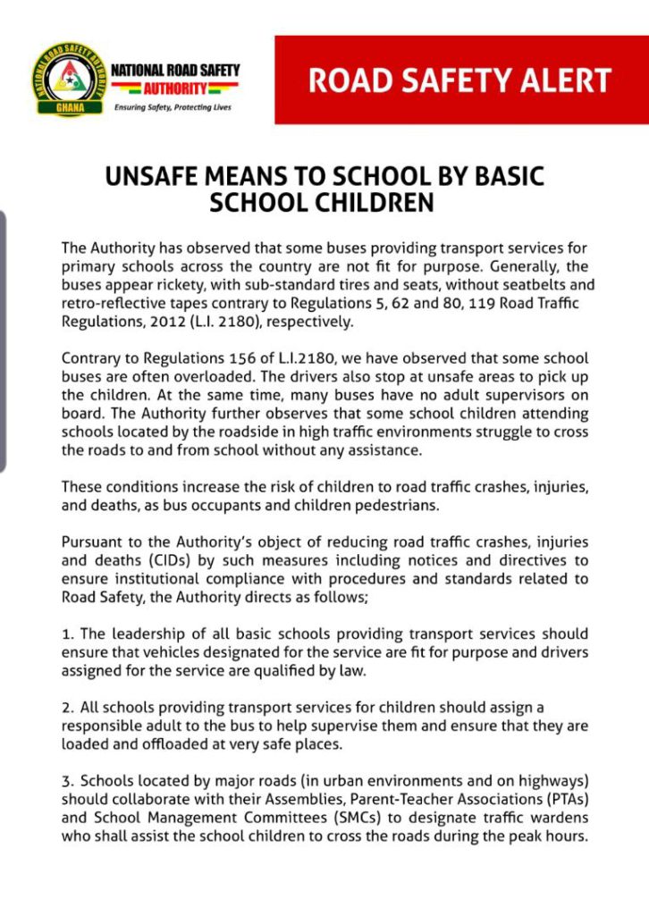 “Please note that the Authority shall not hesitate to impose the necessary Administrative Penalties and other sanctions provided by the National Road Safety Authority Act, 2019 (Act 993) to enforce these directives to improve road safety.”