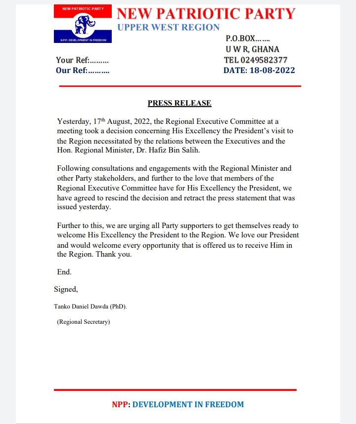 The Regional Executive Committee of the New Patriotic Party (NPP) has rescinded its decision advising party supporters to stay away when President Akufo Addo visits the Upper West Region.
