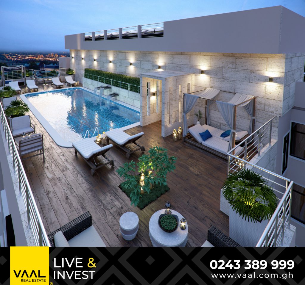 VAAL Real Estate offers properties in prime locations in Accra, Ghana. With high-quality finishes, VAAL guarantees longevity which means you get to save money. Boasting of luxurious amenities from the gym, swimming pool, BBQ areas, landscaping gardens, water fountain, property management, kids playing area, 24/7 high-security system, borehole, full back up-generator, and high-speed lifts, with Vaal, Live & Invest.