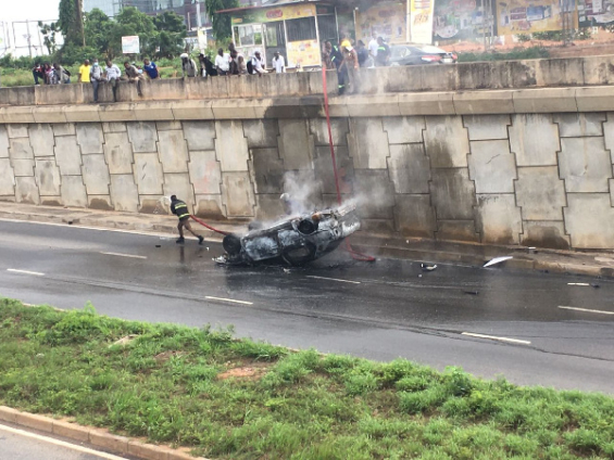 A driver of a Toyota Yaris escaped death when the vehicle caught fire and burnt beyond recognition on the Legon-Madina bypass.
