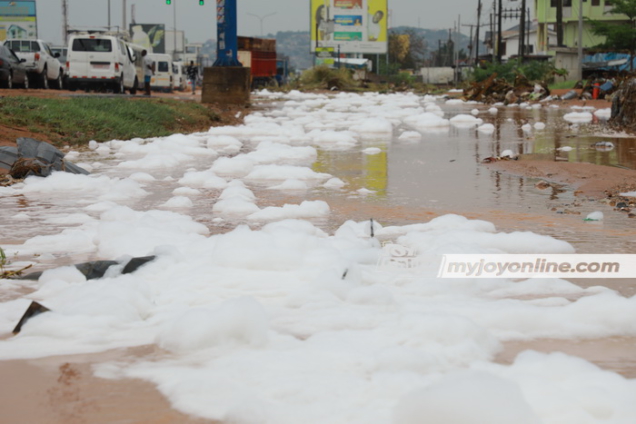 The stinking waste water at New Bortianor in the Ga South municipality of the Greater Accra region, has turned foamy after Tuesday morning’s downpour.