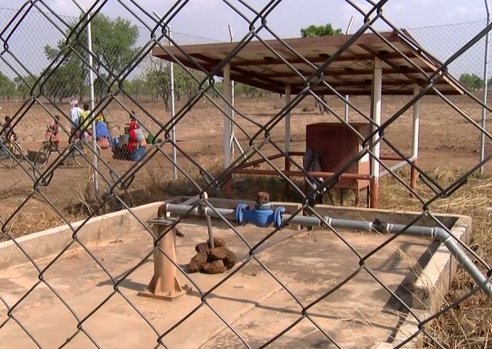 The water tank is connected to a solar mechanized well drilled in 1999. The well was however constructed by international NGO World Vision for the community in 2015 but water does not flow through the pump anymore because of some damaged solar panels.