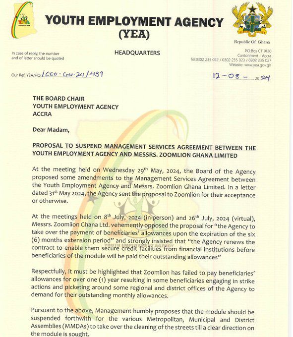 This comes after calls from YEA to suspend the management services contract with Zoomlion due to the long-standing payment issues, affecting hundreds of sanitation workers across the country.