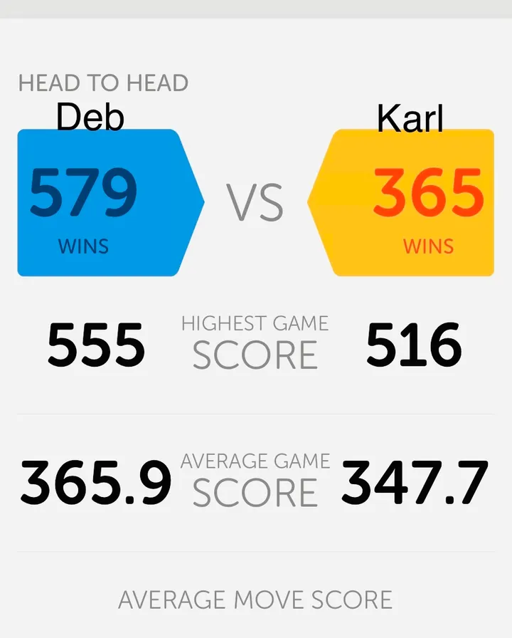 Deb: We don’t talk every day, but it is imperative that we play the game every day. Right now we have over 800 days of consecutive days played and Karl will lose his mind if we reset back to zero days. Once I texted him when I was sick and he told me that unless I’m dead I need to play a word every day. He is very passionate about our streak. If either of us has gone 23 hours without playing a word we start blowing up the other persons phone to “PLAY A WORD NOW.” [Laughs] We usually have three to four games going at all times.