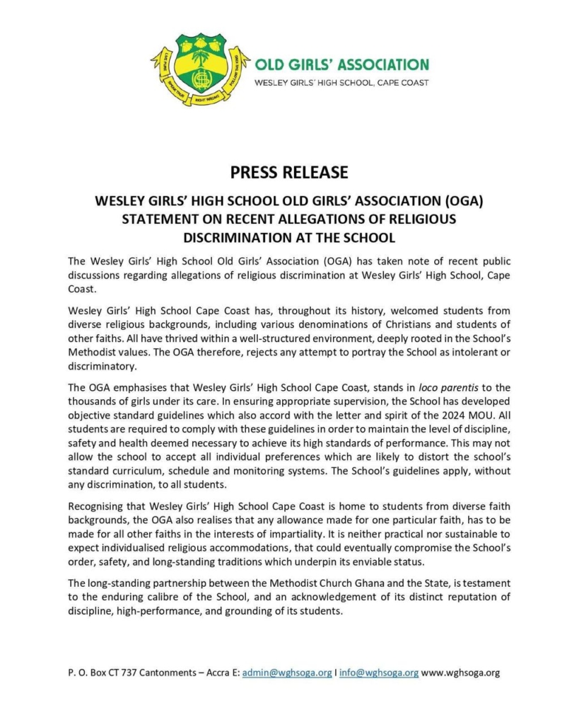 The Wesley Girls’ High School Old Girls’ Association (OGA) has dismissed recent allegations of religious discrimination at the school, describing them as unfounded and inconsistent with the institution’s long-standing record of inclusivity.