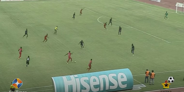 Mfegue holds up the play expertly before playing a reverse pass to Mbella. The ball is being contested by two Aduana Stars defenders, Etouga is unperturbed nonetheless and rifles a first time shot from some 20 yards, sending Kotoko into the break with the lead.