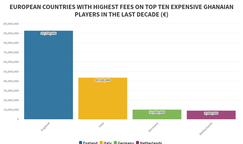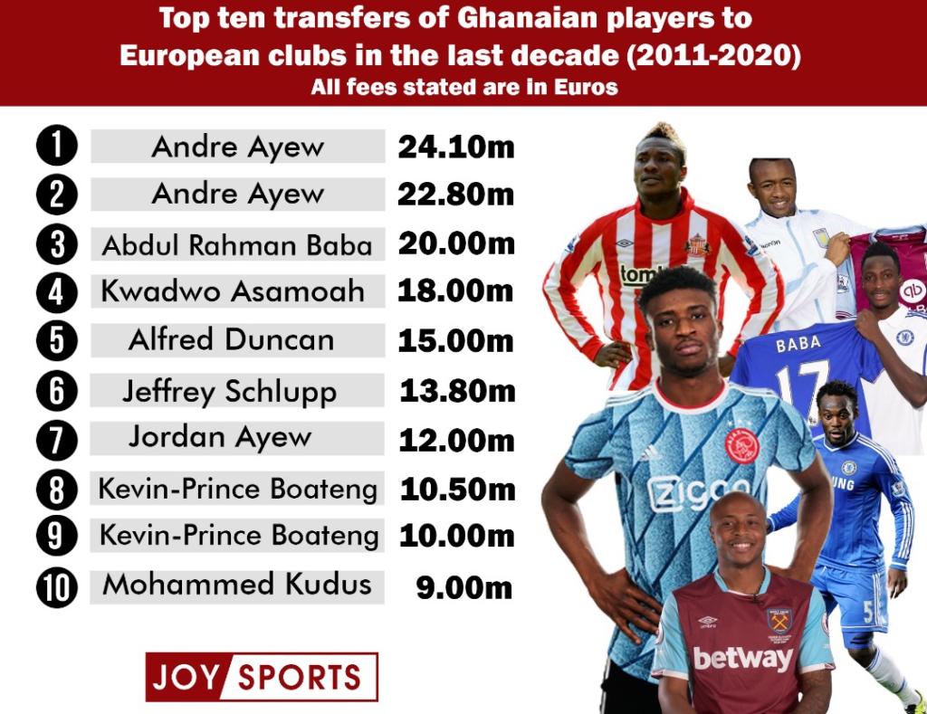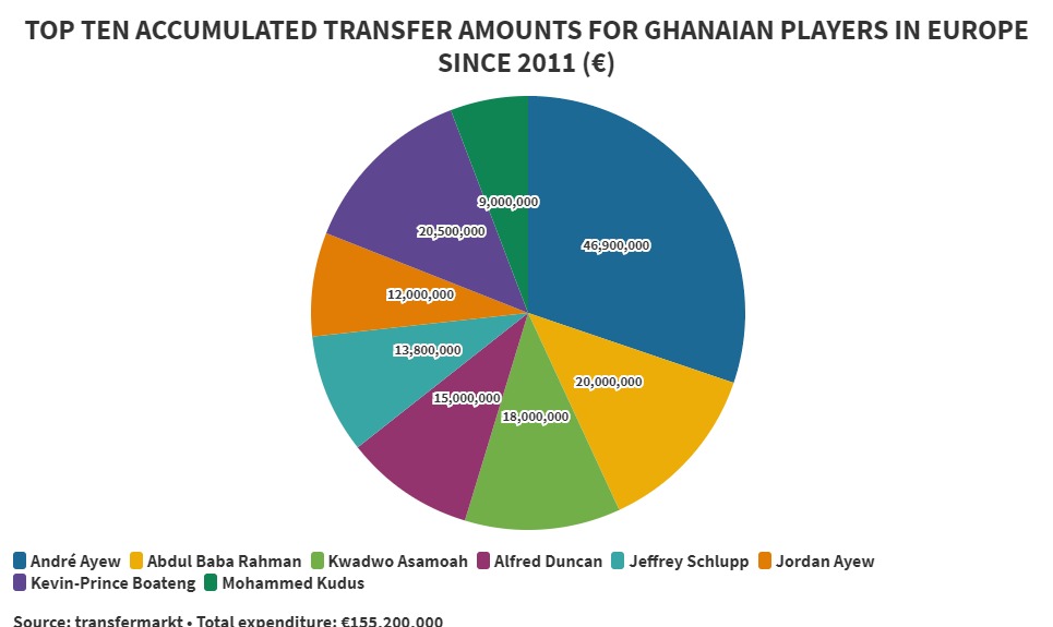 In total, €155.2 million was spent by European clubs on the top ten Ghanaian transfers in the last decade.