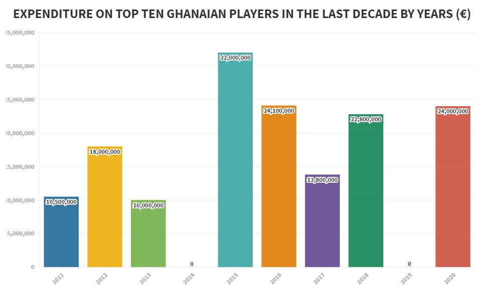 It is followed by the €24.1 million spent in 2016. €24 million was agreed for two Ghanaian players among the top ten (Duncan and Kudus), the third highest comparatively.