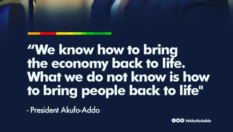 President Akufo-Addo during his fourth address to the nation about measures being taken to curb the spread of the pandemic in the country said “we know how to bring the economy back to life. What we do not know is how to bring people back to life.”