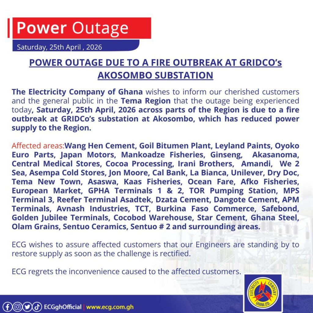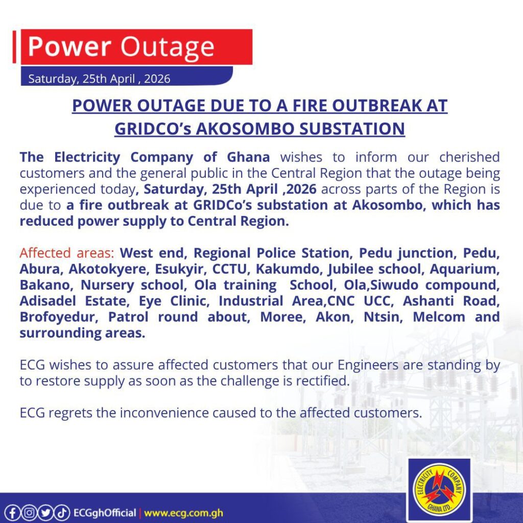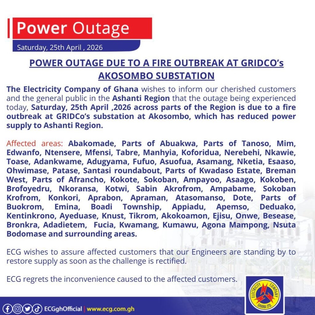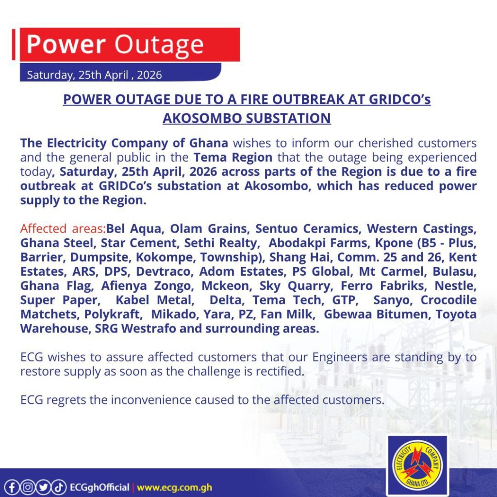 In a series of public notices issued on Saturday, April 25, 2026, the Electricity Company of Ghana (ECG) confirmed that the incident had affected power distribution across the Ashanti Region, Central Region, and Tema enclave.