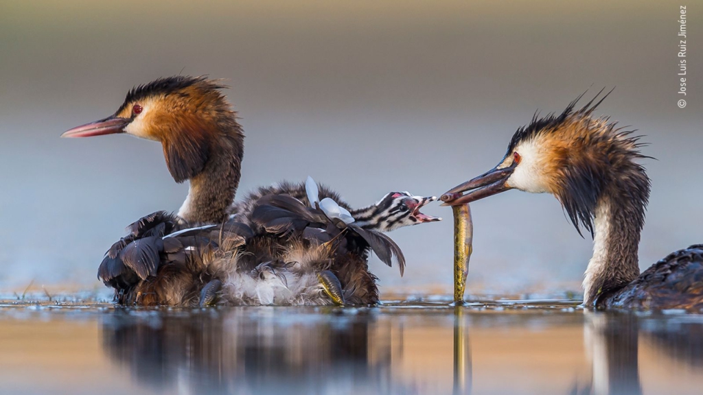 After several hours chest-deep in water near Brozas, in the west of Spain, Luis managed to capture this great crested grebe family. On this particular morning, he got the shot as the parent on breakfast duty emerged from the water with a meal for the chicks.