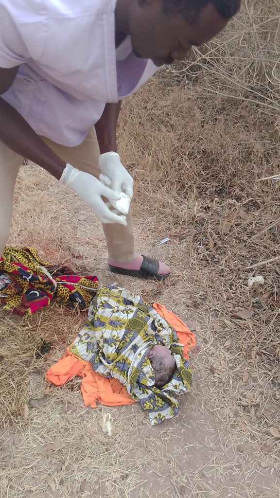 At about 9:15am, a companion of the laboring woman rushed to the Agyata CHPS compound to report that the woman had gone into labour in the bush.