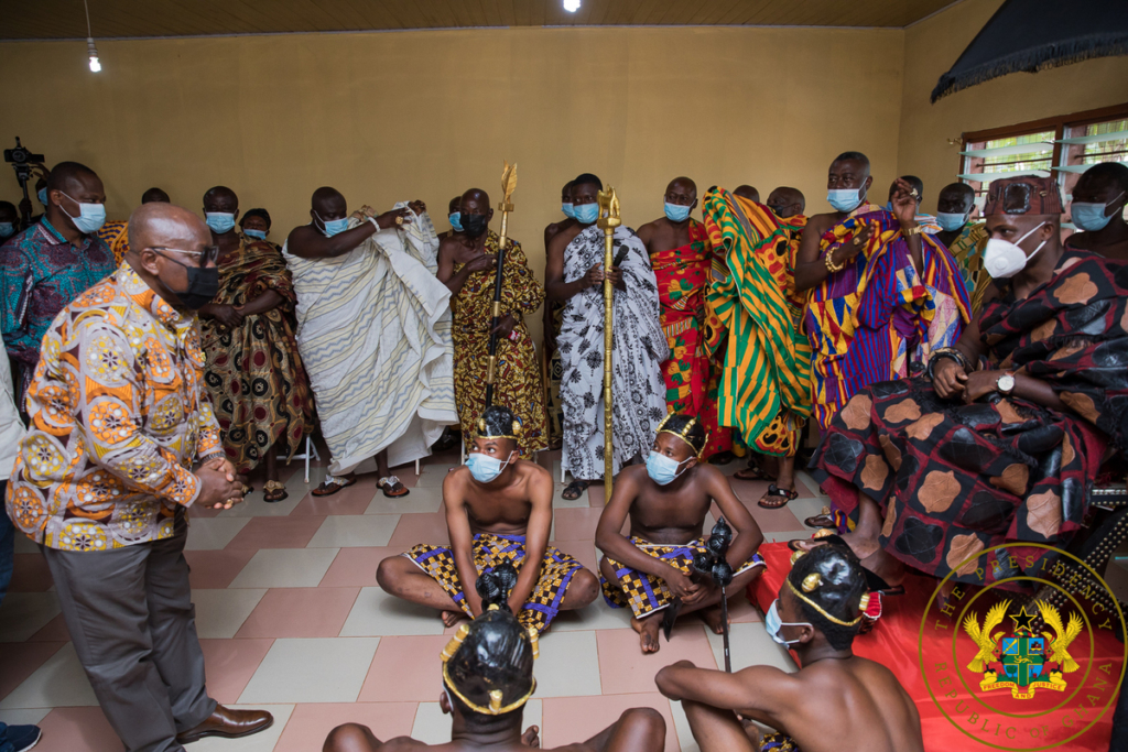 President Akufo-Addo, prior to his visit to the palace of the Nkoranza Paramount Chief, also paid a courtesy call on the Omanhene of Techiman, Oseadeayo Ameyaw Akumfi IV, and inspected ongoing work on an 18-unit classroom block for the Techiman Senior High School.