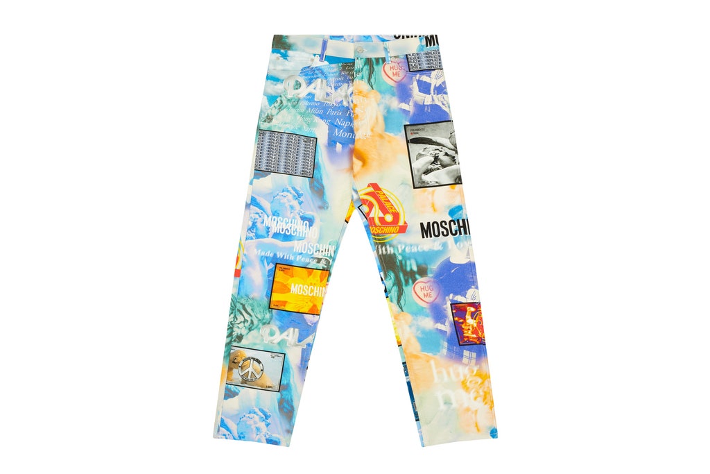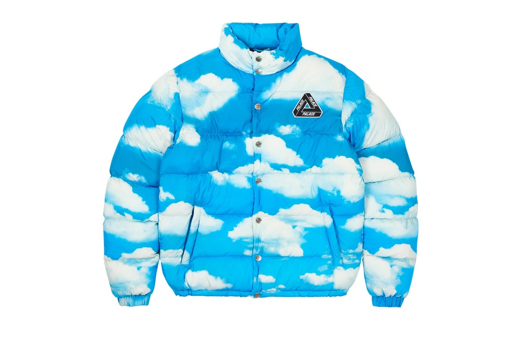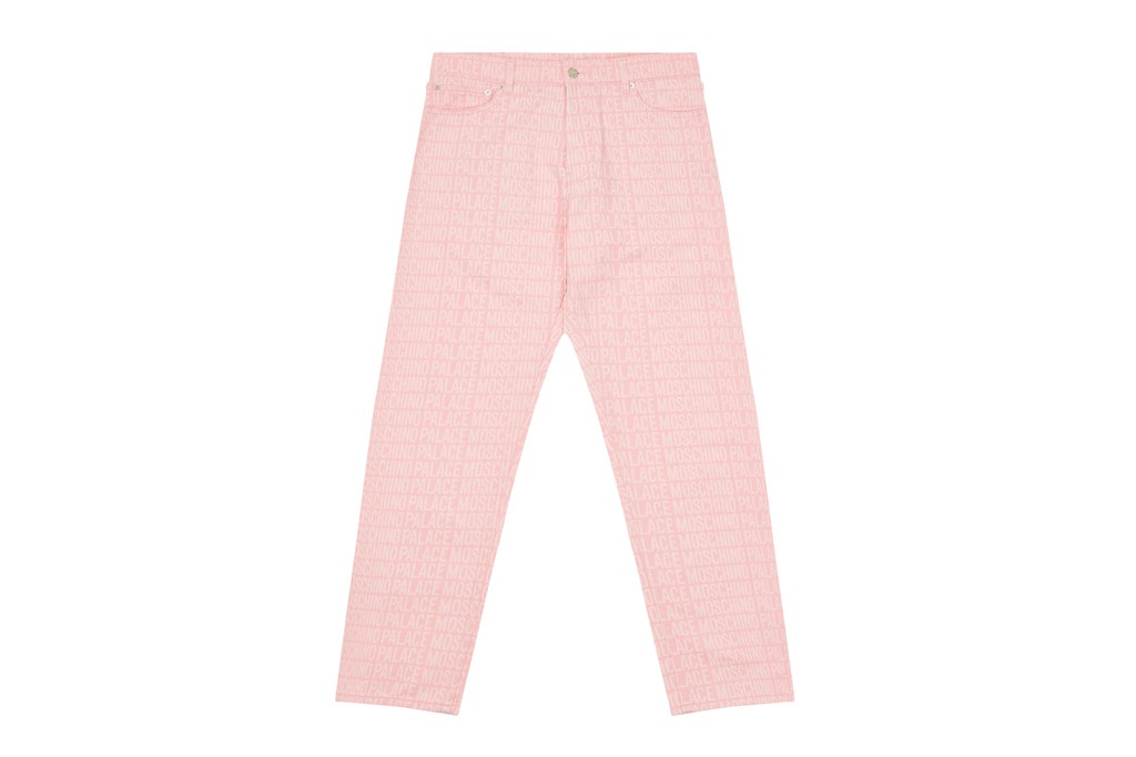 One of the largest drops to come from Palace HQ in recent years, the collection comprises outerwear, shirts, bottoms, knitwear and accessories, with standout products being an all-over Moschino monogram pair of jeans (in blue and pink versions), cloud-emblazoned puffer jackets and a leather milk carton bag.