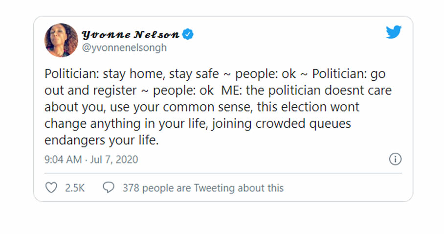 Actress Yvonne Nelson has taken a swipe at politicians for urging Ghanaians to go out in their numbers to partake in the voters’ registration exercise.