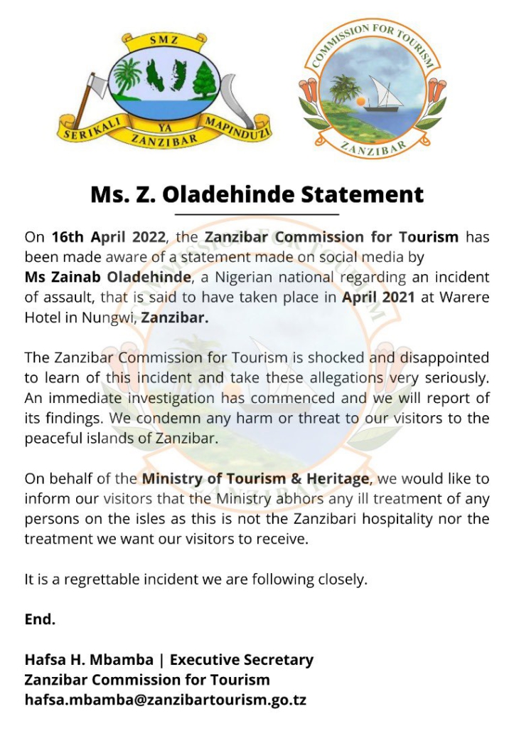In reaction to her story, the Zanzibar Commission for Tourism has noted that it takes seriously, the allegations by the female Nigerian tourist.