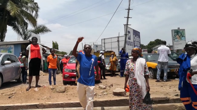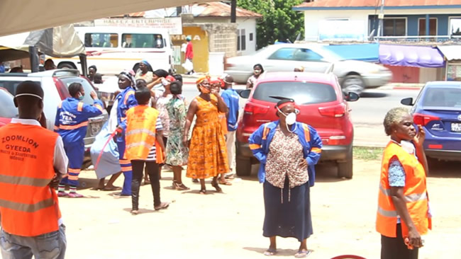 In their working gear and spotting in red bands, the workers of Zoomlion, walked from their converging point at Oforikrom to the premises of Multimedia Group, Luv FM to complain about the treatment being meted to them.